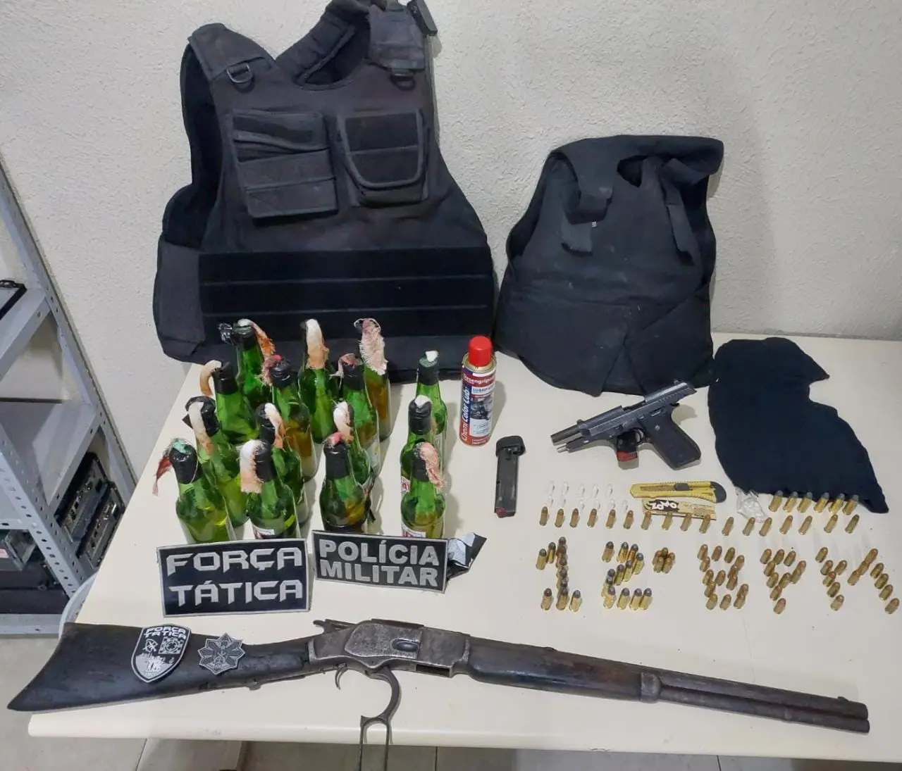 Com os criminosos, foram apreendidos 15 coquetéis molotov, dois coletes balísticos, duas armas de fogo (sendo um rifle calibre Ponto 44 e uma pistola calibre Ponto 40), 87 munições e pequenas quantidades de cocaína e crack.