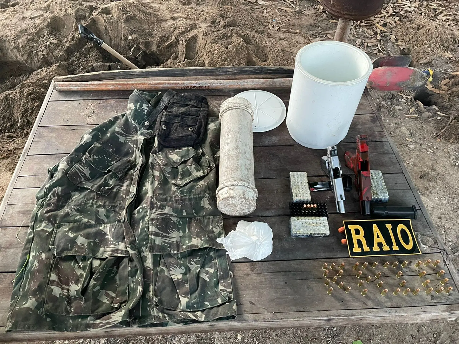 Além disso, também foram encontradas 187 munições enterradas no local, bem como bolsa de proteção, farda mal utilizada do exército e pasta base, usada na produção da cocaína.