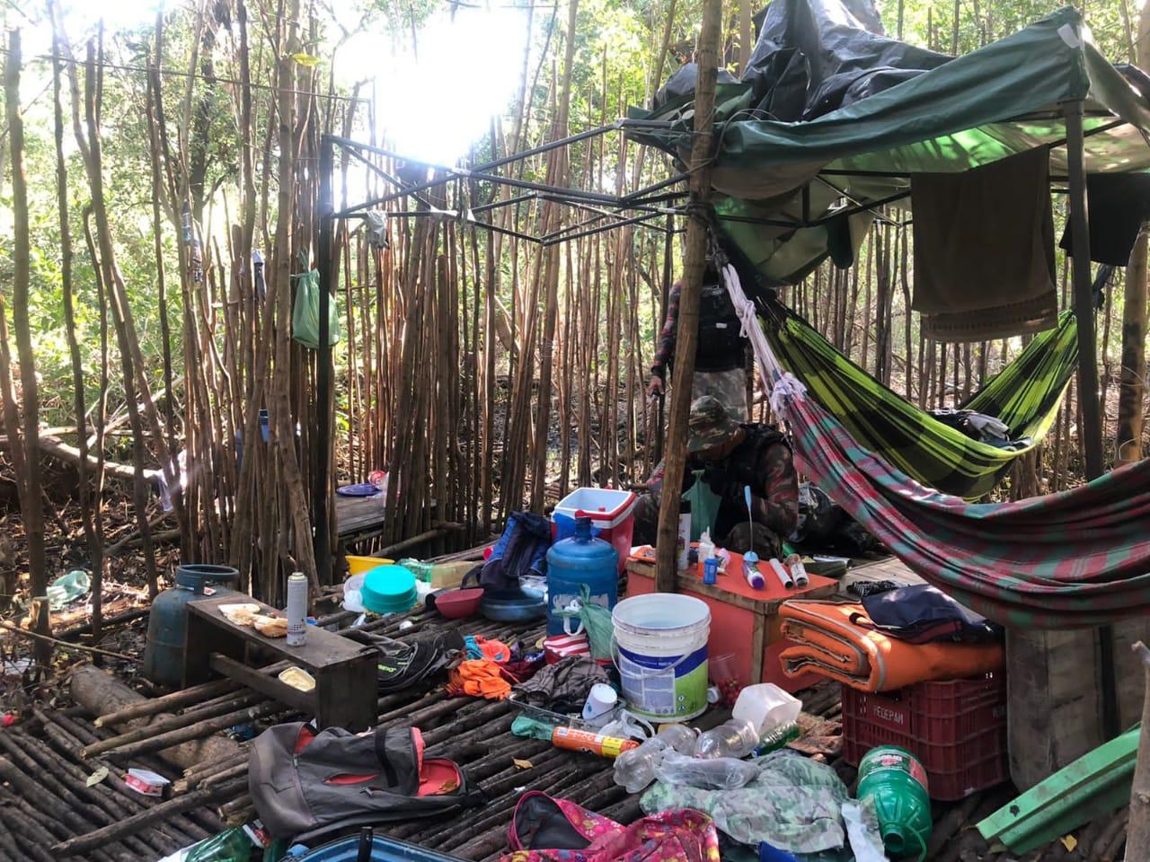 Os PMs ainda percorreram 500 metros no mangue, mas o suspeito não foi localizado. No entanto, o rastro do homem ajudou a polícia a avistar o acampamento, onde havia dois homens que atiraram contra os agentes e também fugiram.