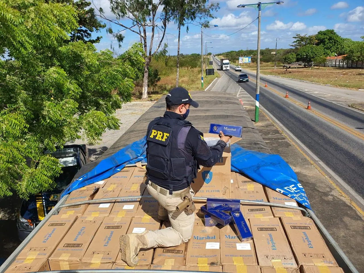 Uma carga contrabandeada com cerca de 252 mil carteiras de cigarro, avaliada em R$ 1,2 milhão, foi apreendida pela Polícia Rodoviária Federal (PRF) no quilômetro 60, da BR-222, em São Gonçalo do Amarante, na manhã deste sábado (15). O veículo foi abordado após os agentes receberem uma denúncia de que um caminhoneiro estaria fazendo manobras perigosas na rodovia.