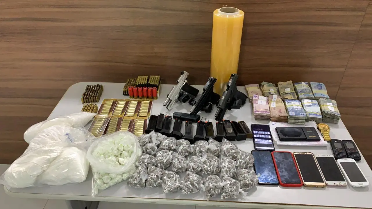 Na residência onde o suspeito foi preso, policiais apreenderam R$ 6,85 mil em espécie, três pistolas, munição de calibres variados, 1,5 kg de cocaína, 800g de maconha, 11g de crack, e objetos usados para o tráfico de drogas.