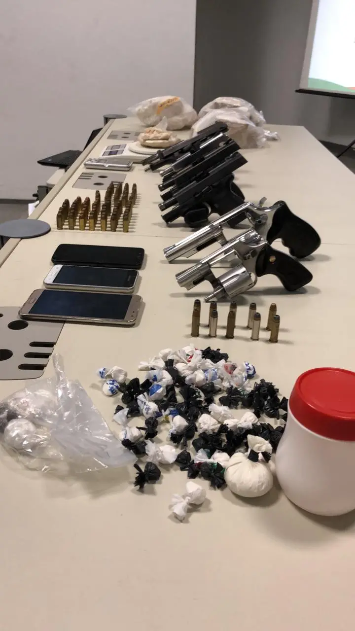 Com os dois foram apreendidos dois revólveres calibre 38, e também crack, cocaína e maconha embalados, prontos para comercialização.