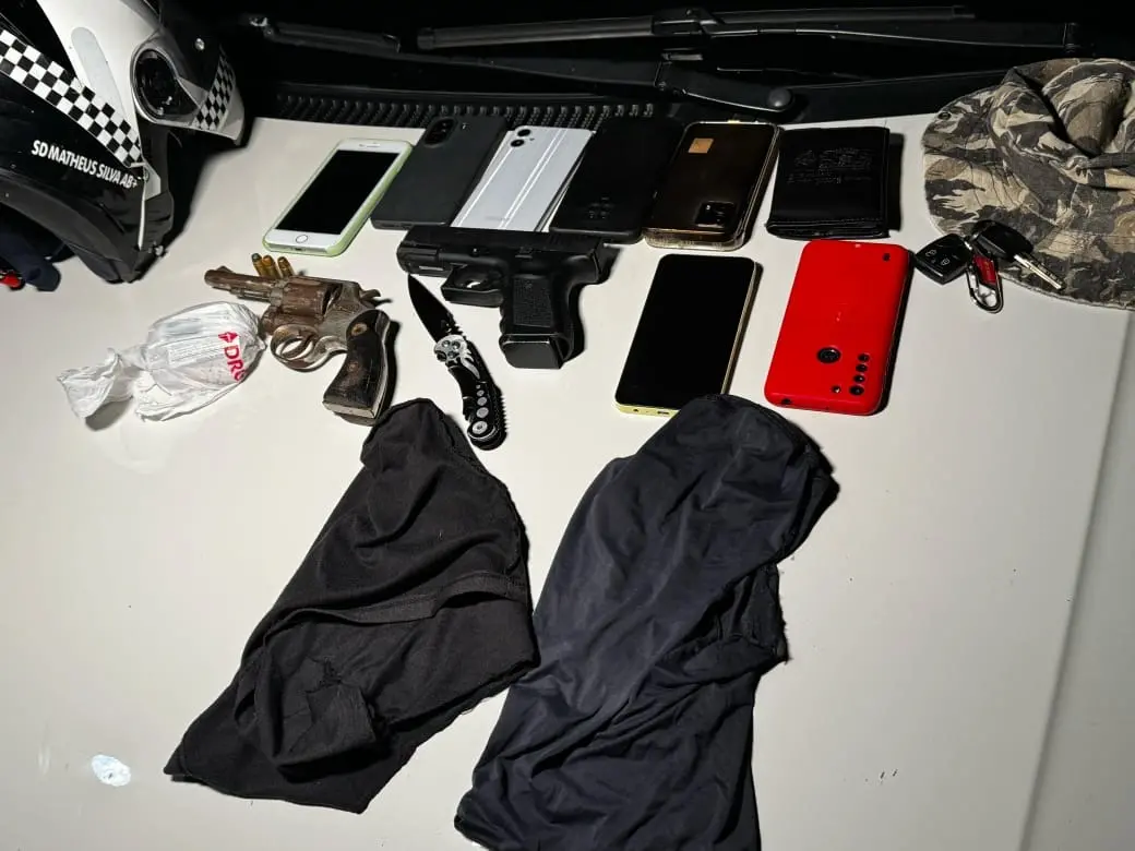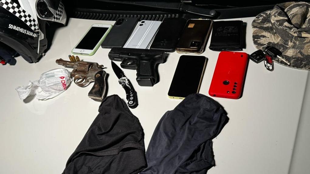 Durante a abordagem, foram apreendidos um revólver, três munições e um simulacro de pistola. Além disso, foram recuperados sete celulares, uma quantia em espécie, 22 fraldas e um veículo que estaria sendo utilizado pelos indivíduos no assalto.