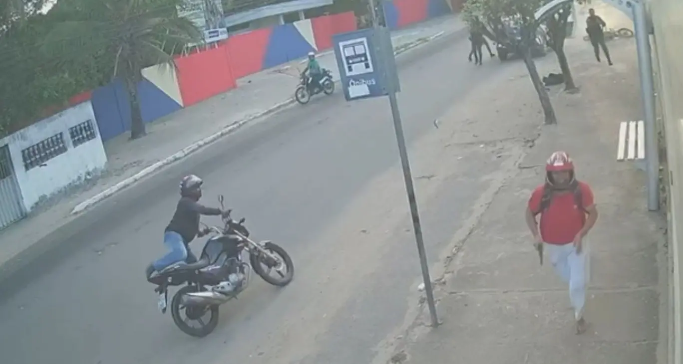 Logo em seguida, uma viatura da Polícia Militar do Ceará (PMCE) aparece na imagem e atropela a motocicleta dos assaltantes, que se levantam e correm em direções opostas. Dois policiais perseguem os suspeitos a pé e atiram contra eles. As imagens não mostram os assaltantes reagirem.