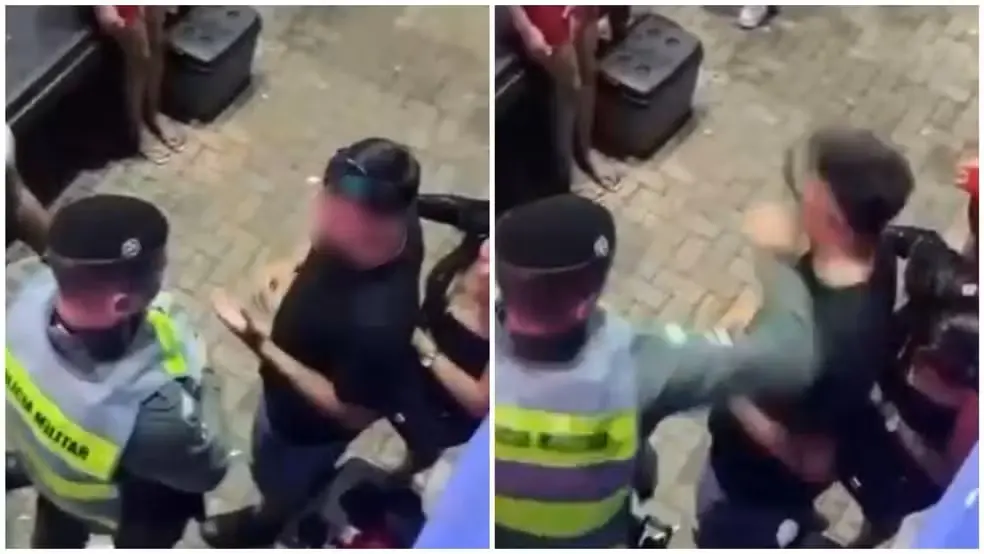 Nas imagens, o homem está de frente para o policial e ambos parecem estar conversando, quando o PM dá um soco no rapaz. Em seguida, outro policial usa um cassetete para agredir novamente o homem, que se afasta.
