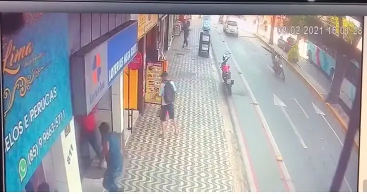 Câmeras da loja registraram o momento do assalto. O resgate do cabo da PM também foi filmado. Ele ainda foi levado em uma caminhonete para o Instituto Doutor José Frota (IJF).