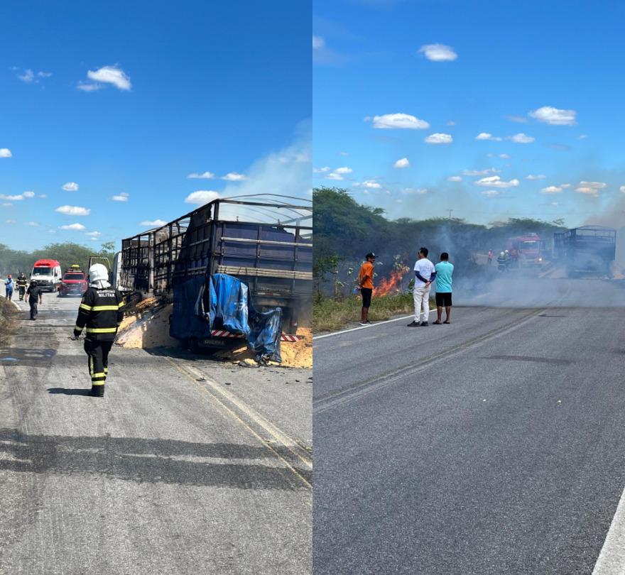 O casal estava na motocicleta. Com o impacto, o caminhão pegou fogo, e as chamas também atingiram a vegetação nas margens da via. Equipes do Corpo de Bombeiros Militar do Estado do Ceará (CBMCE), da Polícia Militar do Ceará (PMCE) e da Perícia Forense do Estado do Ceará (Pefoce) foram acionadas para o local.