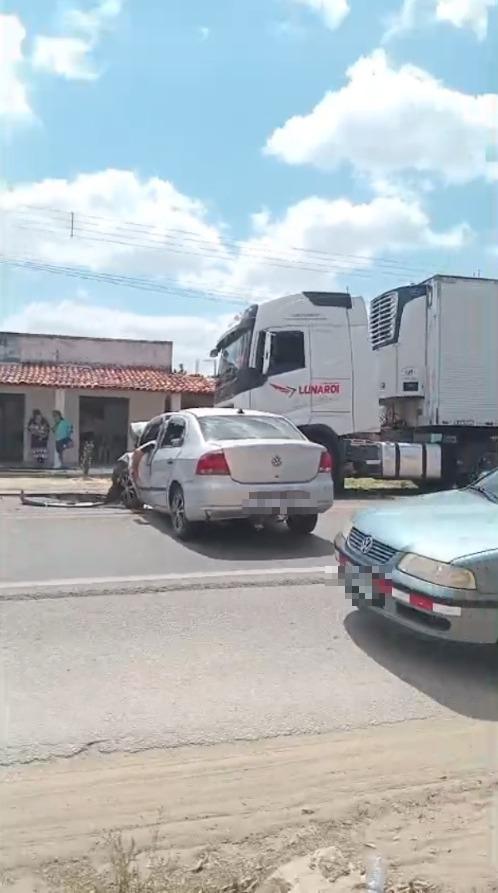 O caso aconteceu no distrito de Catuana. Imagens do acidente mostram que o carro, de modelo Voyage prata, colidiu frontalmente com o veículo maior, até parar na lateral. Ainda conforme a PRF, a ocorrência segue em andamento.
