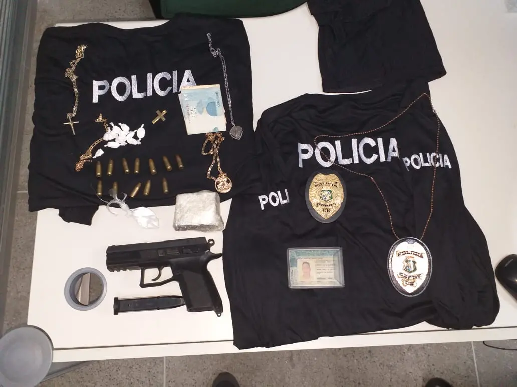 A Polícia Civil do Ceará prendeu em flagrante, na última sexta-feira (20), um homem que se passava por policial para extorquir traficantes de drogas em Caucaia e Fortaleza. De acordo com a Secretaria daSegurança Pública e Defesa Social (SSPDS), Manuel Amaro de Araújo Júnior, de 26 anos, começou a ser investigado após disparar contra uma residência.