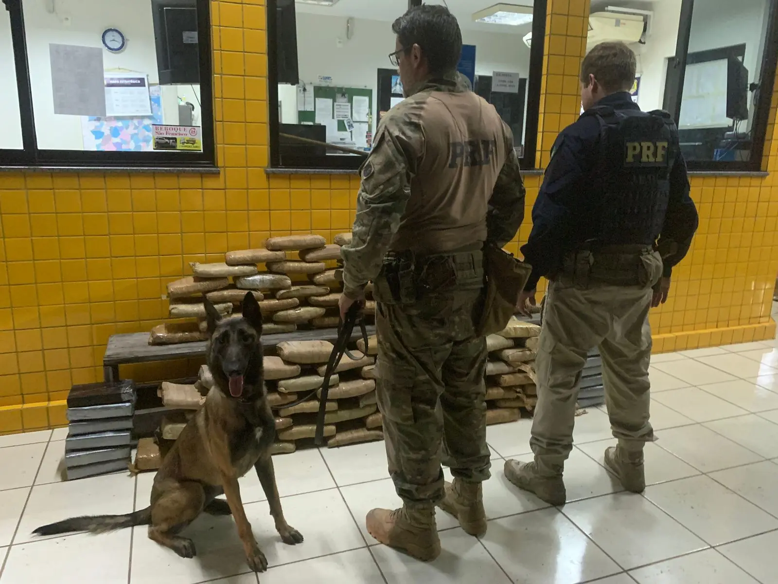 Os cães farejadores Guerra e Faisão, da raça Pastor Belga Malinois, foram capacitados para identificação de drogas, armas e munições. Na ocorrência dessa quarta-feira, Guerra foi muito útil para a localização da droga.
