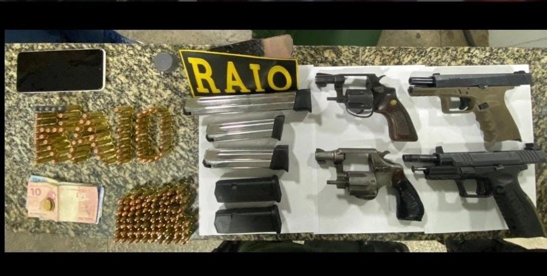 Com a quadrilha, foram apreendidos duas pistolas de calibre 9mm, dois revólveres de calibre 38, 105 munições intactas calibre 9mm e 39 munições intactas calibre 38.