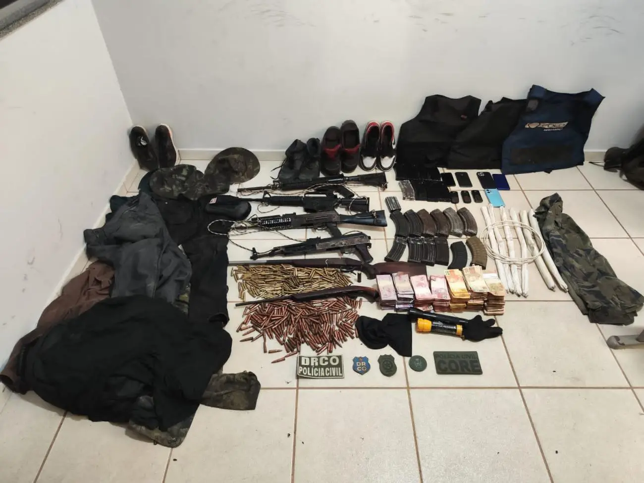 Com a quadrilha, a Polícia apreendeu 6 armas de fogo (sendo 4 fuzis e 2 espingardas), mais de 400 munições de grosso calibre, 21 carregadores de armas, explosivos, 2 coletes balísticos, R$ 70 mil em espécie, 8 aparelhos celulares e lanternas.