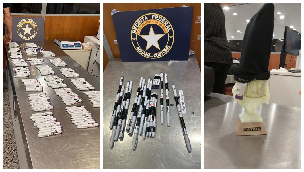 No domingo (20), um passageiro em um voo da Air France oriundo da Holanda escondia 45 canetas de Mounjaro no forro da mala. Já na segunda-feira (21), a fiscalização identificou uma passageira que desembarcava de Portugal, em voo da Latam, carregando 57 unidades do medicamento escondidas entre roupas e dentro de imagens de santos.