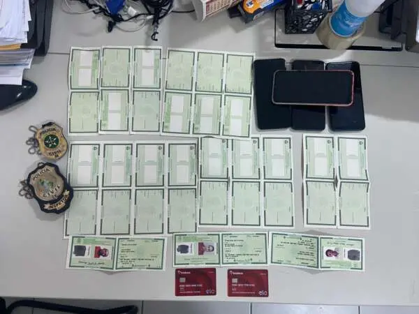 Foram apreendidos três identidades, papel-moeda utilizado para a confecção de RGs, dois cartões de banco e quatro celulares.