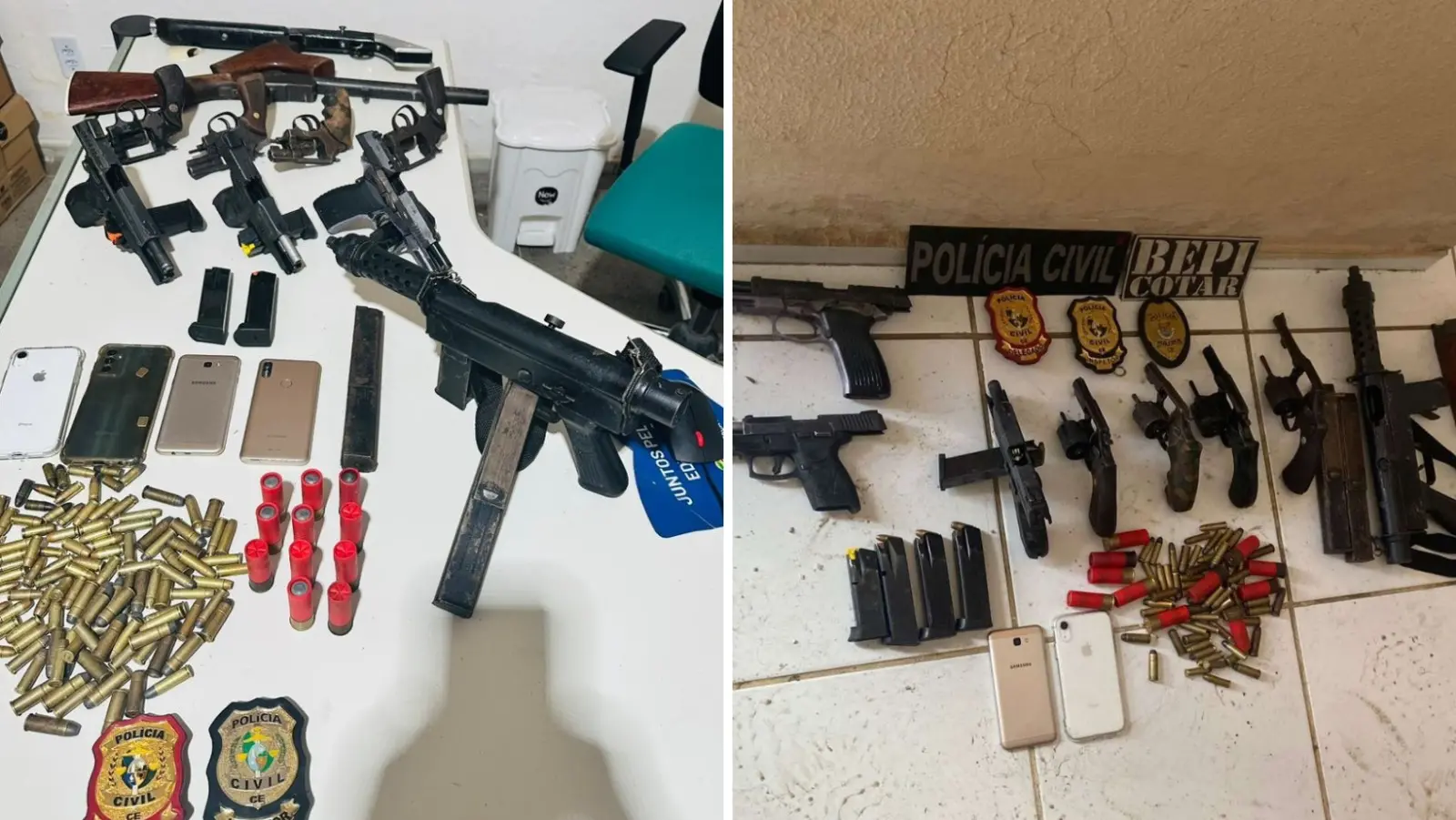As buscas na residência resultaram na apreensão de uma metralhadora, um rifle, três espingardas, quatro pistolas e quatro revólveres. Após a abordagem no local, os três suspeitos, o adolescente e todo o material ilícito apreendido foram conduzidos para a Delegacia Metropolitana de Maranguape.