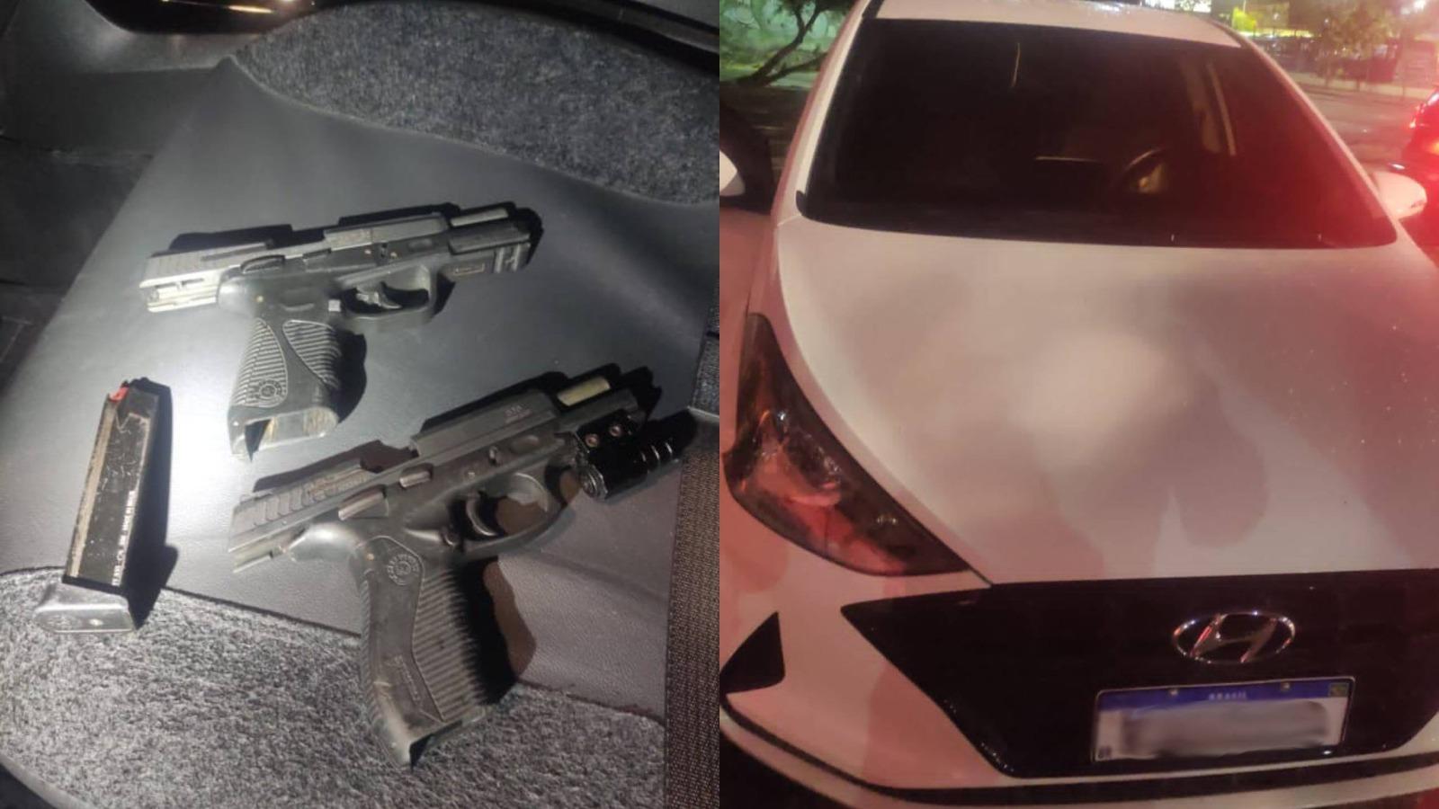 Com o trio, foram apreendidas duas pistolas municiadas - uma calibre 380 (com uma lanterna tática) e uma calibre Ponto 40 - uma balaclava e dois aparelhos celulares. Os PMs descobriram que o veículo estava com as placas adulteradas e que tinha queixa de roubo.
