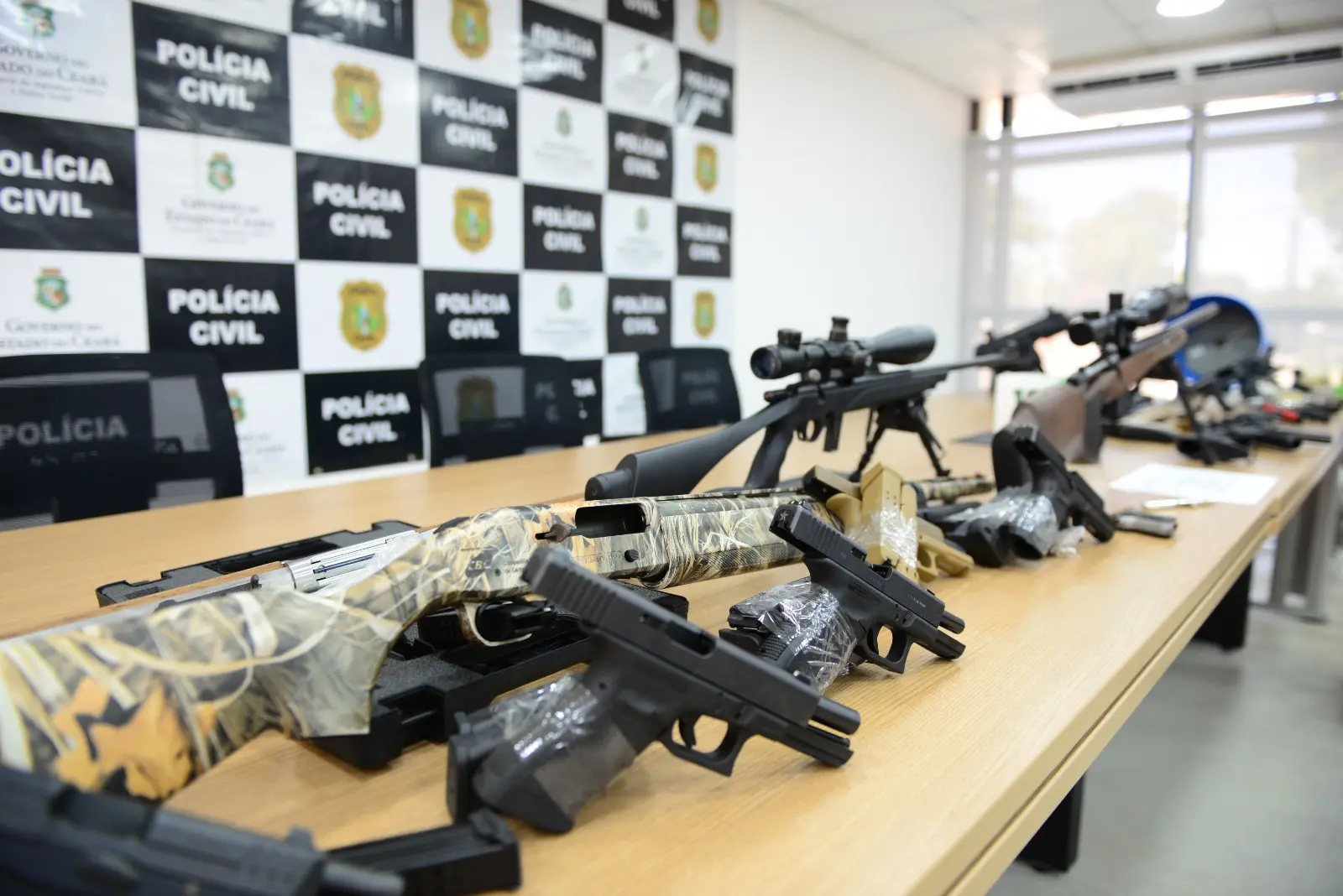 armas de fogo foram apreendidas apenas com Francisco Océlio de Araújo, de 43 anos, em um imóvel no bairro Presidente Vargas, em Fortaleza. Sendo um fuzil Ponto 308, um fuzil calibre 556, um rifle Ponto 38, um rifle calibre 22, três espingardas calibre 12, uma carabina Ponto 40, um revólver Ponto 44, dois revólveres calibre 38, três pistolas 9mm, duas pistolas Ponto 45 e uma pistola Ponto 380. Uma caneta que atira também foi apreendida.