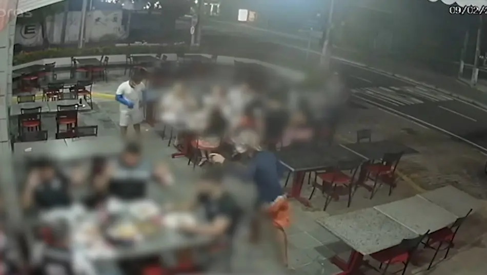 As imagens mostram os suspeitos abordando os clientes, que ocupavam apenas duas mesas da área externa do estabelecimento no momento da ação, por volta das 22h30.