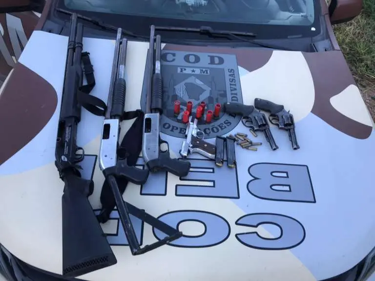 De acordo com a Secretaria da Segurança Pública, a Polícia Militar encontrou com o trio um carro, armas de fogo e explosivos.