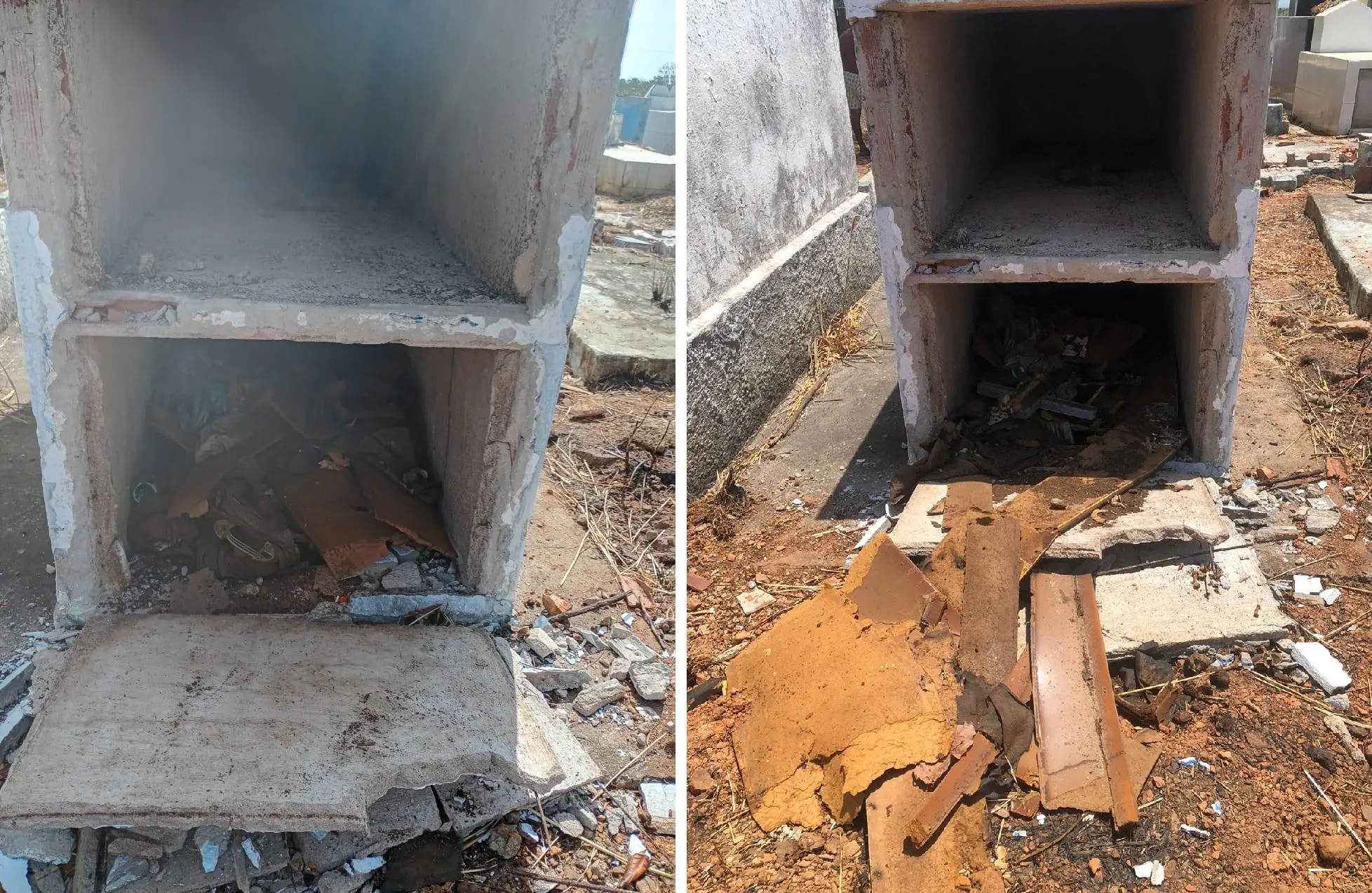 A reportagem recebeu imagens de pelo menos dois túmulos quebrados, que mostram também ossos humanos espalhados pelo Cemitério dos Gomes, como é conhecido o local. Familiares dos mortos passaram mal e precisaram ser levados ao hospital municipal. Ninguém foi preso pelo crime, até a publicação desta matéria.