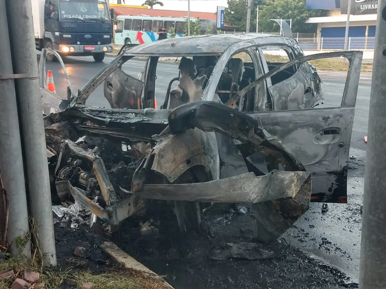 Já o carro, teve o motor, a lataria e os estofados atingidos pelo fogo, ficando destruído. Os bombeiros estiveram no local e apagaram o incêndio.