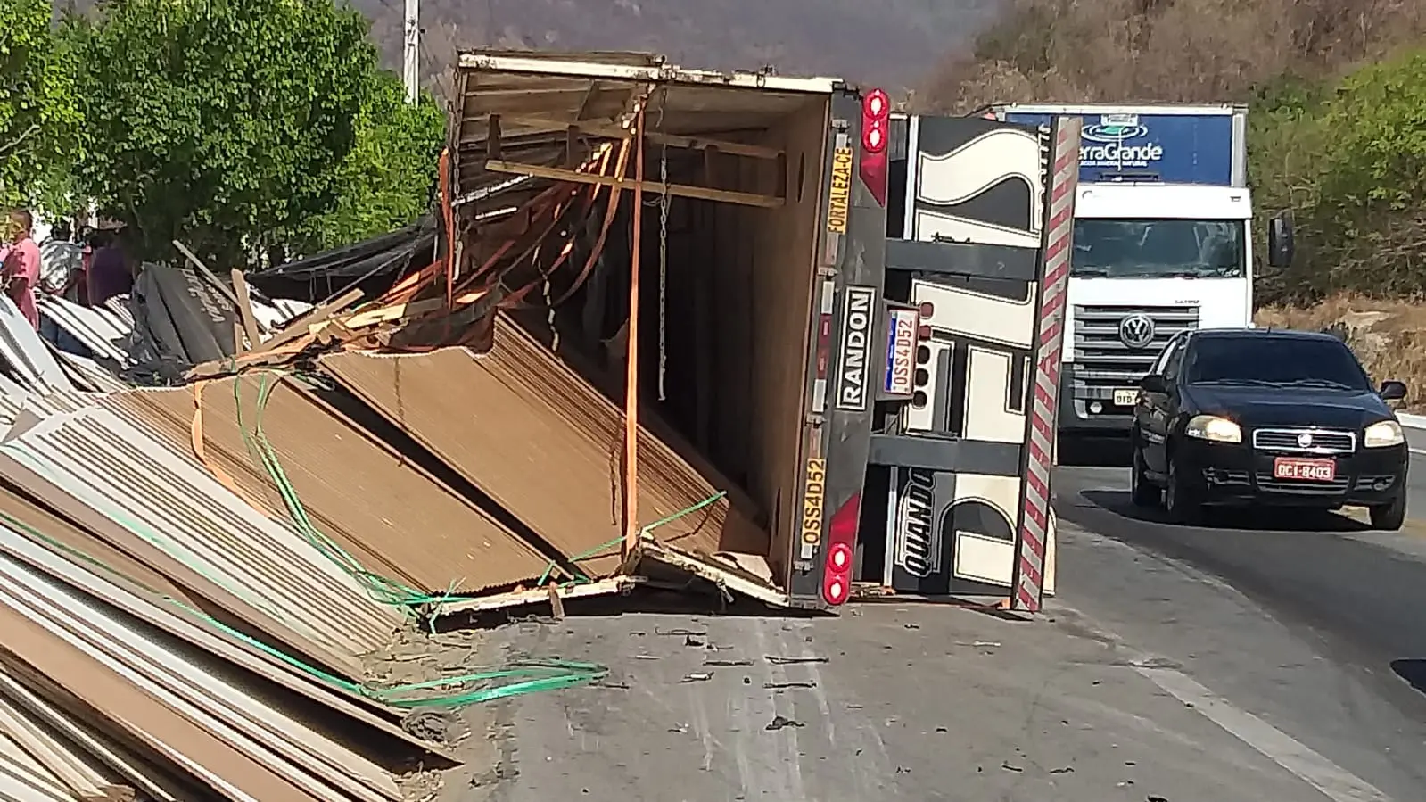 Nas imagens, é possível ver outros caminhões logo atrás do veículo tombado. Os outros motoristas conseguiram frear e evitar outro acidente.