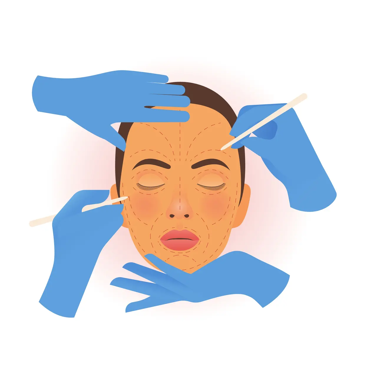 - Toxina botulínica: pode ser usada para levantar ou arquear as sobrancelhas, suavizar rugas de expressão, relaxamento do músculo mentoniano com alongamento do queixo, melhorar bandas platismais no pescoço, melhorar o ângulo da mandíbula e elevação da ponta nasal. Consiste na aplicação intramuscular de toxinas com relaxamento do músculo envolvido.