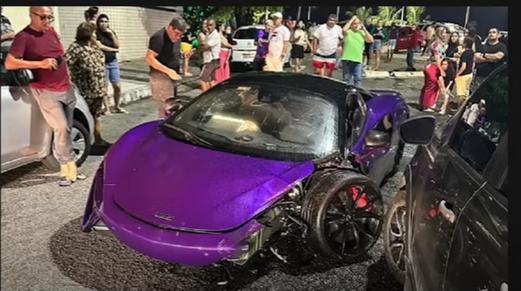 Avaliado em mais de R$ 2 milhões, o veículo importado é um McLaren Artura, da cor roxa. Com o impacto, as rodas do automóvel saíram e pedaços da estrutura se espalharam no local.