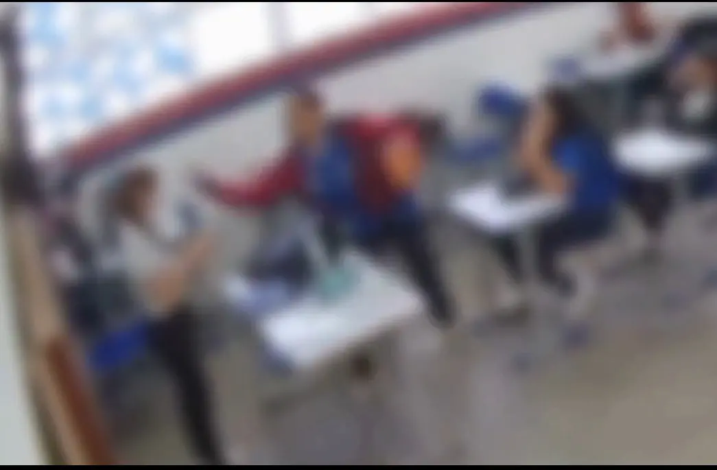 Nas imagens, o adolescente aparece se levantando, caminhando em direção à docente e, após uma breve conversa, desferindo um tapa no rosto dela.