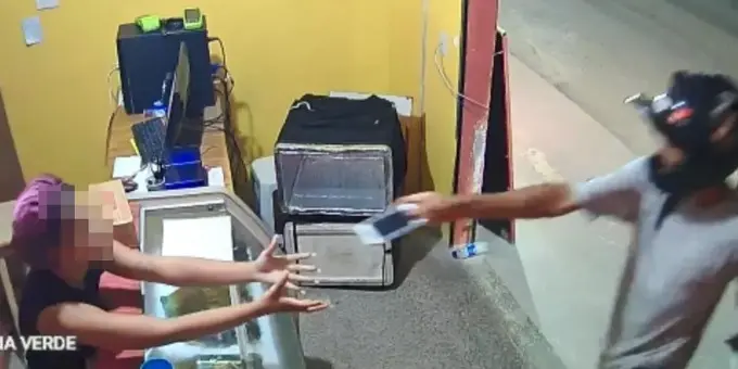 A ação foi registrada por uma câmera de segurança do estabelecimento. As imagens mostram o homem chegando ao local com um comparsa, que aguarda na rua, em uma motocicleta. De capacete, ele entra no estabelecimento com a arma já em punho e aponta para o rosto da atendente.