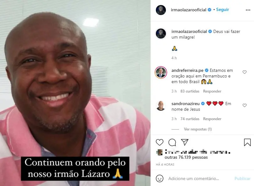 Já na manhã desta sexta-feira (26), a equipe de assessoria de Lázaro pediu por orações constantes direcionadas ao estado de saúde do vereador. "Deus vai fazer um milagre!", disse publicação feita no Instagram.
