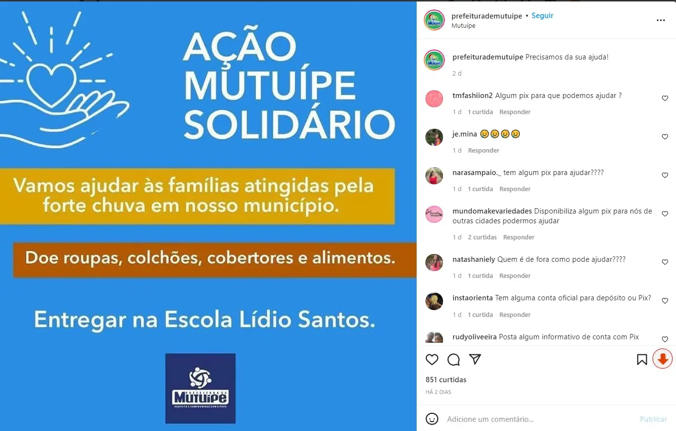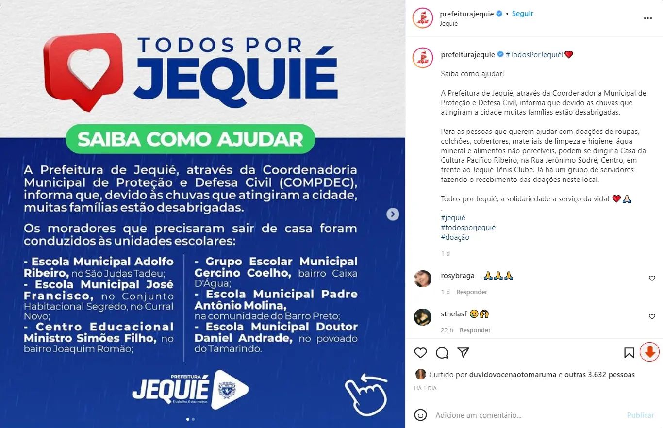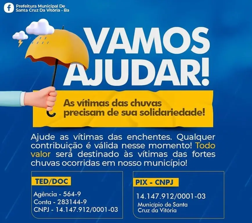 As prefeituras de Itabuna, Mutuípe, Jequié e Santa Cruz da Vitória são algumas das cidades que publicaram artes nas redes sociais com pedidos de doações.