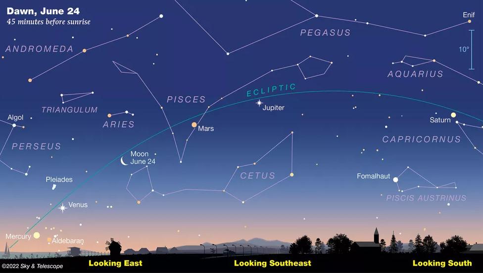 Os cinco planetas estarão brilhantes o suficiente para se poder observar da Terra. O site AccuWeather também aponta que a lua crescente estará alinhada aos astros, brilhando entre Vênus e Marte.