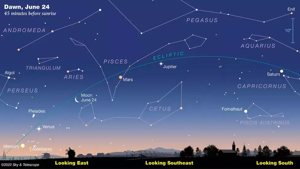 O melhor horário para ver os cinco planetas e a lua é 30 minutos antes do nascer do sol. Para conseguir assistir, basta ter uma visão limpa e sem muitas obstruções do horizonte.