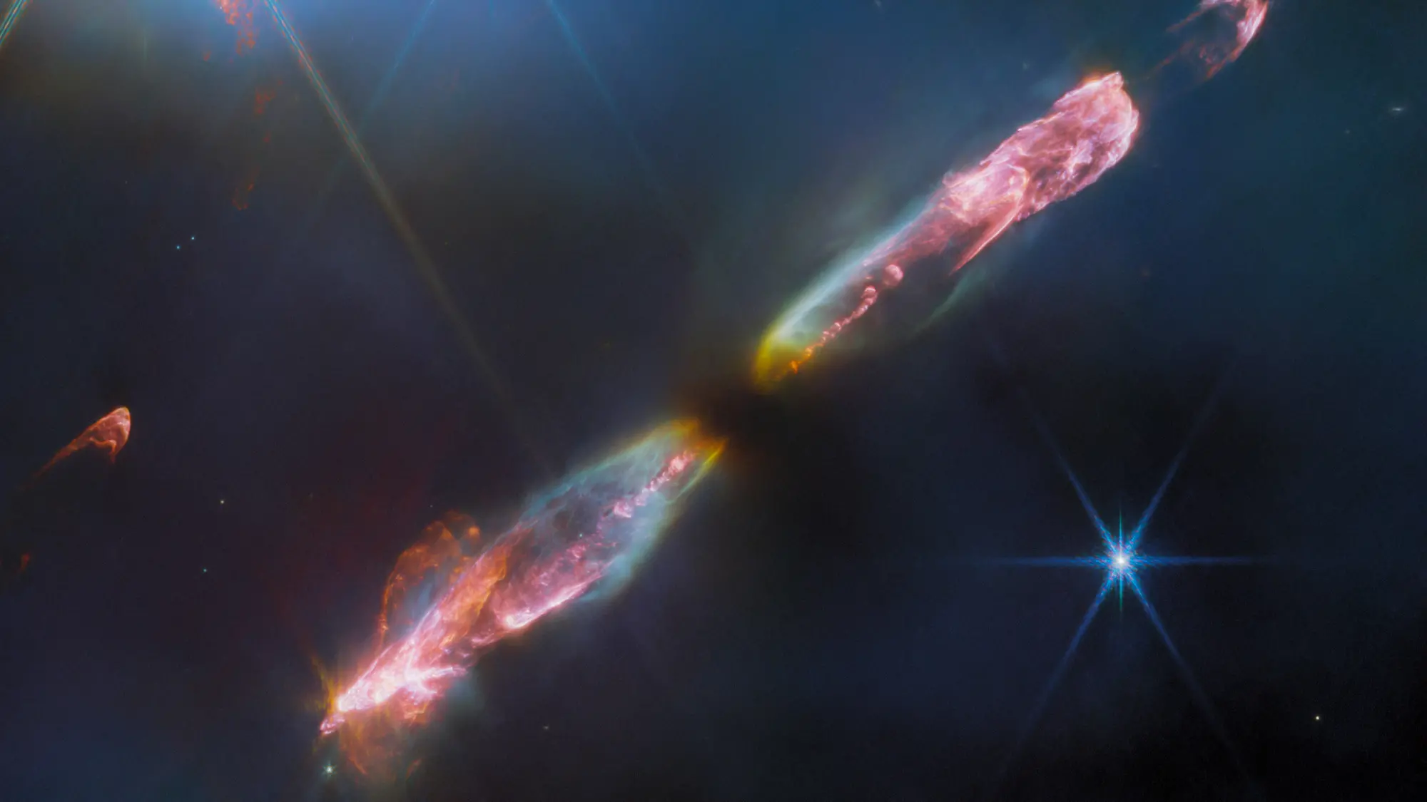 A Nasa publicou uma imagem curiosa feita pelo supertelescópio espacial James Webb, nesta quinta-feira (14). O equipamento registrou uma estrela jovem, equivalente ao que seria o Sol quando era uma "criança", expelindo matéria em forma de dois jatos em direção oposta.