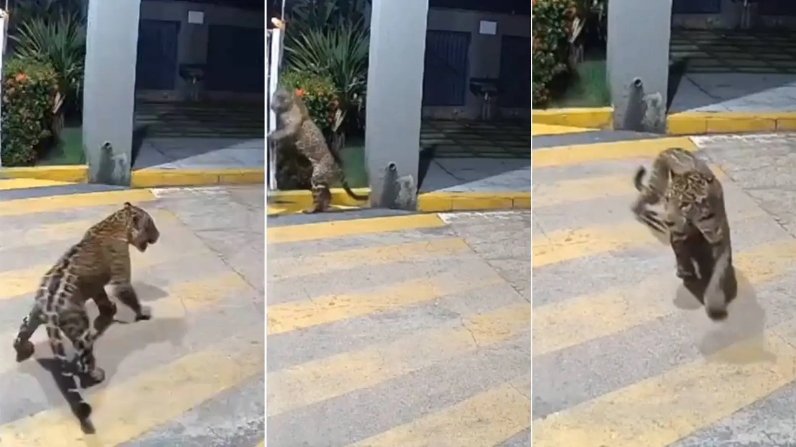 A gravação foi compartilhada por uma pessoa que disse residir no local, na rede social X (antigo Twitter). "E do nada uma onça resolveu aparecer pelo condomínio onde eu moro", escreveu.