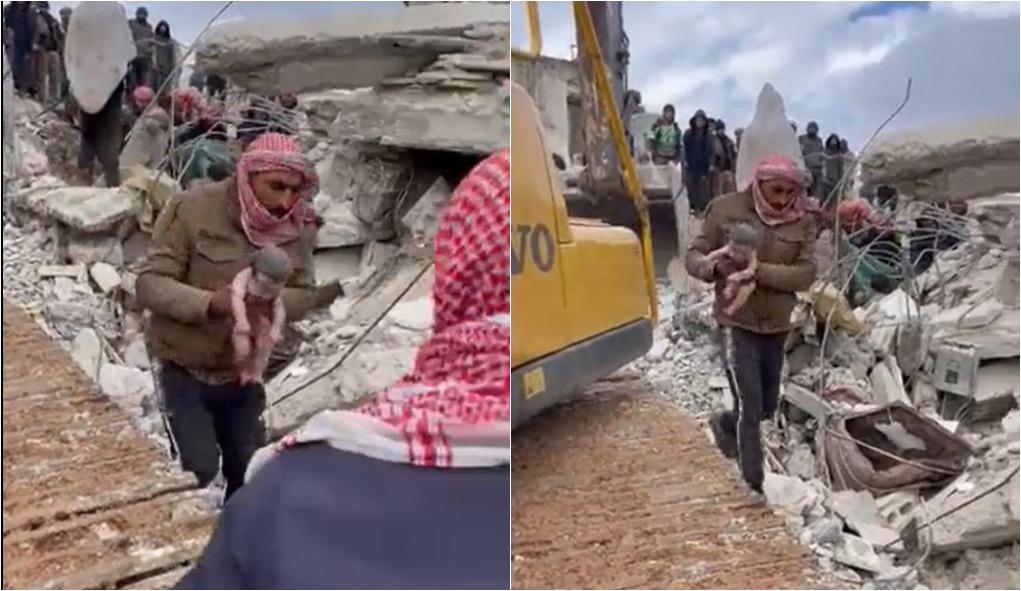 Em um vídeo que viralizou nas redes sociais, a bebê aparece sendo carregada por um homem, coberta de poeira nos escombros, com o cordão umbilical ainda pendurado.