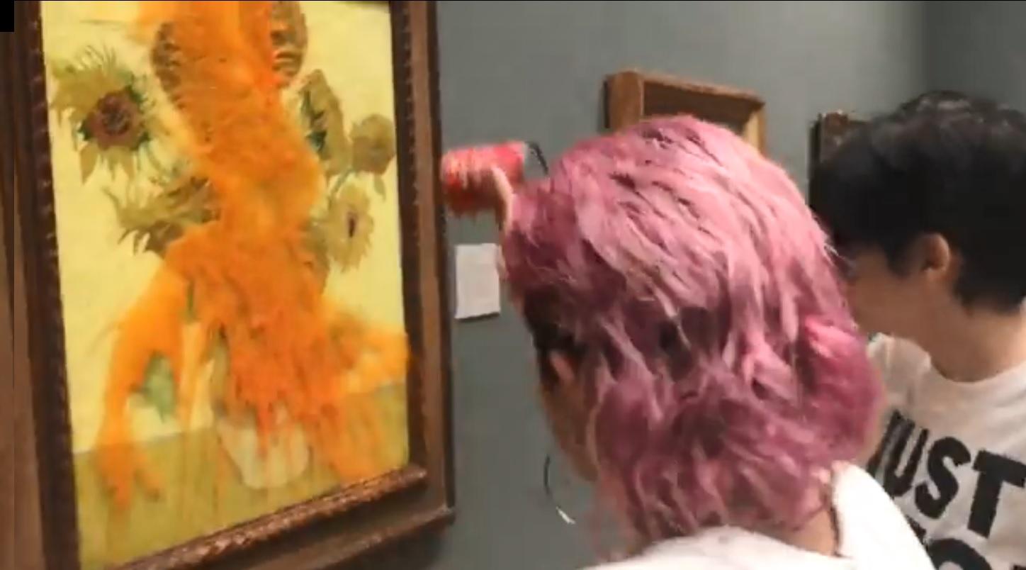 A dupla parecia se colar na parede adjacente aos "Girassóis" de Van Gogh (1888). Elas também jogaram uma substância vermelha — o que parece ser tomate (sopa) — sobre a pintura.