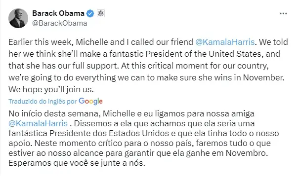 Os Obamas emitiram um comunicado dizendo que irão fazer “tudo o que pudermos para eleger Kamala Harris como a próxima presidente dos Estados Unidos”. Eles acrescentaram: “E esperamos que você se junte a nós”.