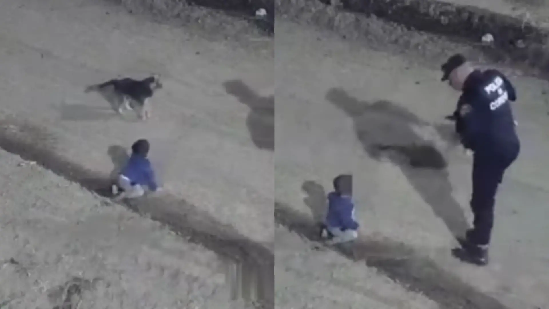 Na gravação, é possível ver o menino engatinhando na rua e logo em seguida um cachorro aparece. Um agente encontra o bebê e o pega nos braços.