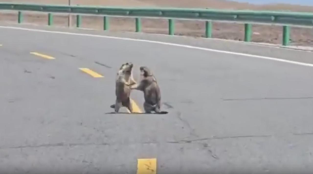 Duas marmotas brigaram em plena rodovia na China e causaram um engarrafamento de veículos. A cena inusitada foi gravada no dia 20 de abril, mas viralizou nas redes sociais nesta segunda-feira (12).
