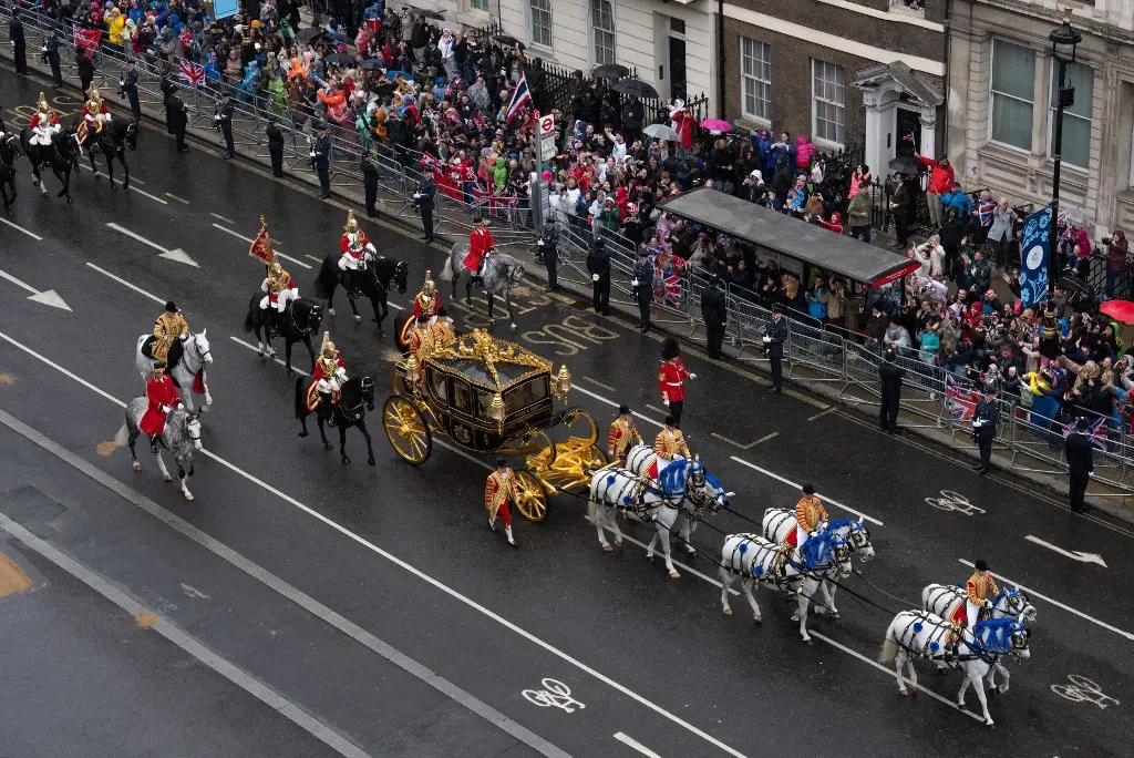 Após a coroação, Charles III trocou de carruagem, passando para a Carruagem de Ouro. Esta última foi construída em 1760 e usada em todas as coroações desde 1831 e é puxada por oito Widsor Grey. Ela, no entanto, não é a favorita da realeza e é considerada extremamente desconfortável.