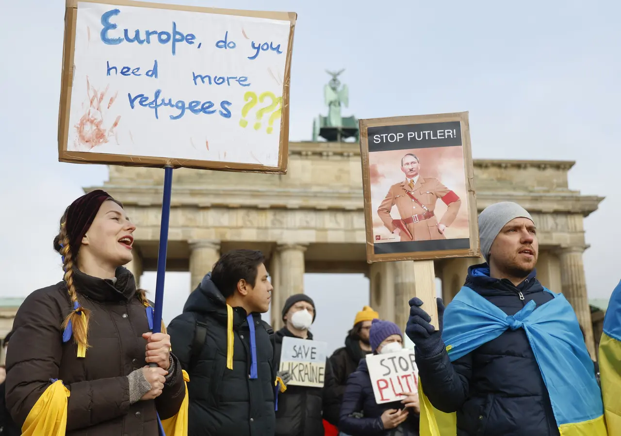 "Berlim a 670 km da linha de frente", "Stop the Killer" ("Pare o assassino", em português), "Não à Terceira Guerra Mundial" eram algumas das frases em faixas e cartazes dos manifestantes, que responderam em massa ao chamado da comunidade ucraniana que vive na Alemanha.