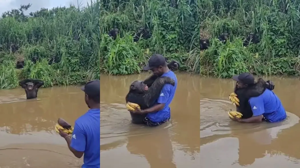 Um chimpanzé abraçou um dos integrantes de uma ONG que atua no resgate de animais em Camarões, e o gesto afetuoso viralizou nas redes sociais. O momento, que ocorreu em um rio no fim de junho deste ano, foi filmado e divulgado nas redes da Papaye International, que apontou que o animal teria reconhecido o antigo cuidados dele.