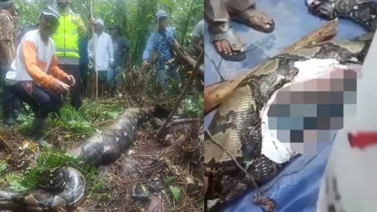 O corpo de mulher de 54 anos de idade foi encontrado dentro de uma cobra píton de sete metros de comprimento. O caso aconteceu no último domingo (23), na província de Jambi, na Indonésia.