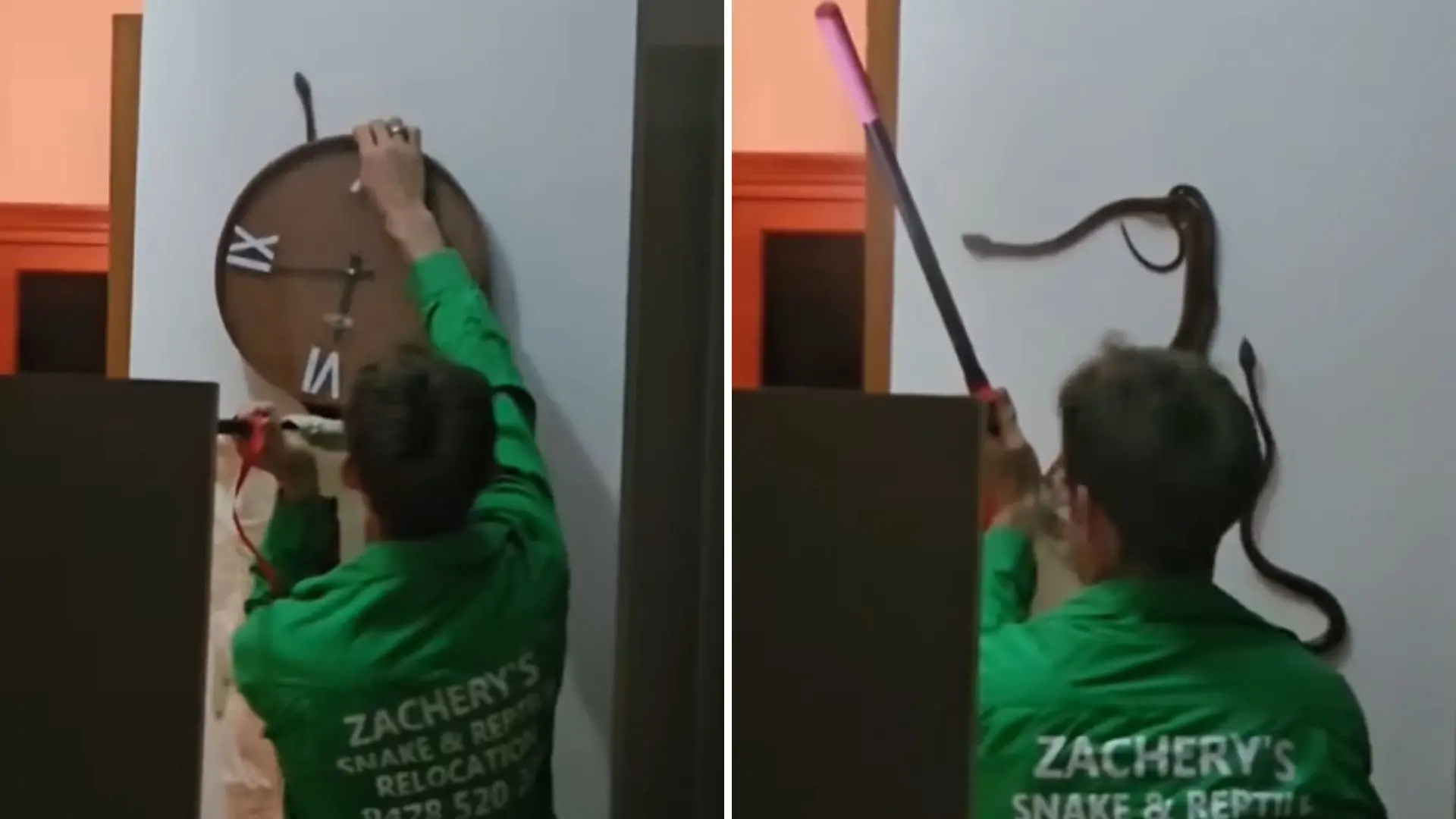 Duas cobras foram resgatadas durante um ritual de acasalamento atrás de um relógio. O caso aconteceu em uma casa em Queensland, na Austrália, na semana passada, quando um morador percebeu a movimentação no objeto e acionou uma equipe especializada.