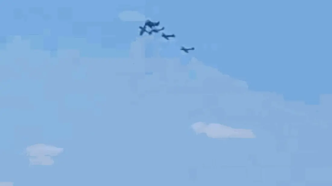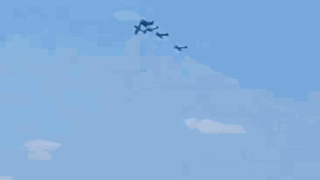 Em um vídeo publicado nas redes sociais, seis aviões aparecem realizando uma exibição a dezenas de metros do solo. De repente, um deles parece se chocar contra outra aeronave antes de cair no solo em meio a uma nuvem de fumaça.