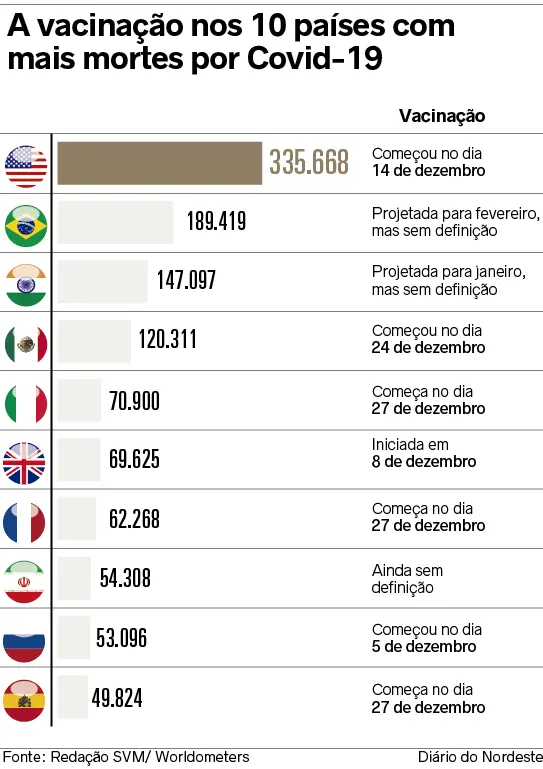 Com mais de 7,4 milhões de casos confirmados, o Brasil se aproxima da marca de 190 mil mortes causados pela Covid-19. Com isto, é o segundo mais mais atingido pela pandemia, tanto em número de registros da doença como em óbitos. Contudo, o país só deve iniciar a vacinação antes do Irã, que ainda não definiu data para o início da vacinação. No caso do país do Oriente Médio, no entanto, as sanções impostas pelos Estados Unidos ao governo, o Irã tem enfrentado dificuldades para realizar transferências internacionais e negociar a compra de vacinas.