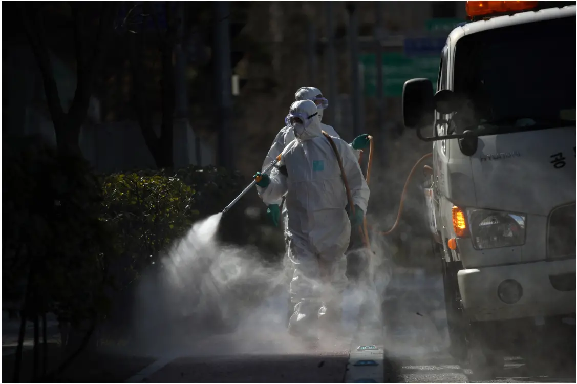 Na Coreia do Sul, funcionários do Governo pulverizam desinfetantes pela ruas, a fim de diminuir o contágio de Covid-19. O país é o quarto mais afetado, no mundo inteiro, pela nova epidemia, com mais de 50 pessoas mortas e 7.000 infectados.
