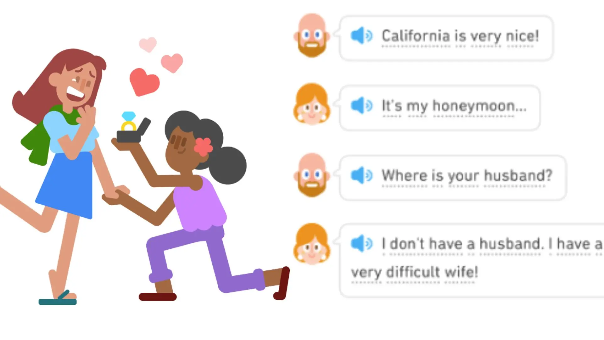 O órgão estatal de vigilância da mídia russa, Roskomnadzor, ordenou que o Duolingo cumprisse a lei do país que proíbe a “propaganda de relações sexuais não tradicionais” após ativistas conservadores identificaram frases como “Ben e Peter se amam” e “Clara conheceu sua esposa Maria em um bar lésbico” na plataforma.